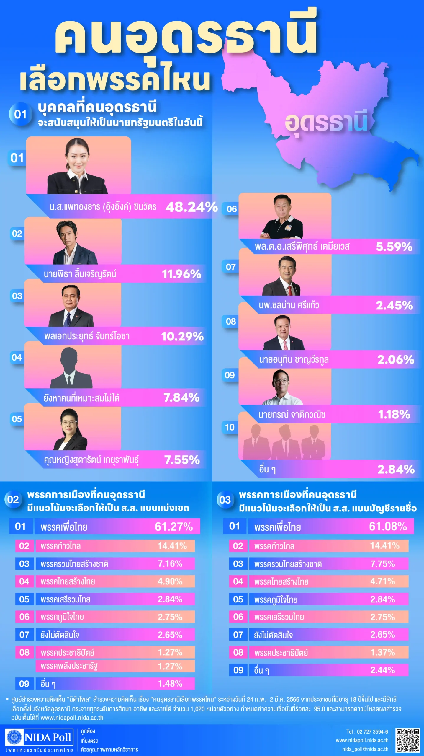 จากการสำรวจเมื่อถามถึงบุคคลที่คนอุดรธานีจะสนับสนุนให้เป็นนายกรัฐมนตรีในวันนี้ พบว่า อันดับ 1 ร้อยละ 48.24 ระบุว่าเป็น น.ส.แพทองธาร (อุ๊งอิ๊งค์) ชินวัตร (พรรคเพื่อไทย) เพราะ ต้องการเปิดโอกาสให้คนรุ่นใหม่เข้ามาบริหารประเทศ ชื่นชอบพรรคเพื่อไทย นโยบายของพรรคเพื่อไทยสามารถทำได้จริง ขณะที่บางส่วนระบุว่า ชื่นชอบผลงานในอดีตของตระกูลชินวัตร อันดับ 2 ร้อยละ 11.96 ระบุว่าเป็น นายพิธา ลิ้มเจริญรัตน์ (พรรคก้าวไกล) เพราะ ต้องการเปิดโอกาสให้คนรุ่นใหม่เข้ามาบริหารประเทศ มีวิสัยทัศน์ แบบคนรุ่นใหม่ และชื่นชอบนโยบายของพรรคก้าวไกล อันดับ 3 ร้อยละ 10.29 ระบุว่าเป็น พลเอกประยุทธ์ จันทร์โอชา (พรรครวมไทย สร้างชาติ) เพราะ เป็นคนตรงไปตรงมา พูดจริงทำจริง มีความซื่อสัตย์สุจริต ทำให้บ้านเมืองเกิดความสงบ ขณะที่บางส่วนระบุว่า จะได้บริหารประเทศอย่างต่อเนื่อง อันดับ 4 ร้อยละ 7.84 ระบุว่า ยังหาคนที่เหมาะสมไม่ได้ อันดับ 5 ร้อยละ 7.55 ระบุว่าเป็น คุณหญิงสุดารัตน์ เกยุราพันธุ์ (พรรคไทยสร้างไทย) เพราะ ชื่นชอบนโยบายของพรรคไทยสร้างไทย มีประสบการณ์ในการบริหารประเทศ ขณะที่บางส่วนระบุว่า ต้องการเปิดโอกาสให้ผู้หญิงเข้ามาบริหารประเทศ อันดับ 6 ร้อยละ 5.59 ระบุว่าเป็น พล.ต.อ.เสรีพิศุทธ์ เตมียเวส (พรรคเสรีรวมไทย) เพราะ เป็นคนตรงไปตรงมา พูดจริงทำจริง มีความซื่อสัตย์สุจริต และชื่นชอบวิธีการทำงาน อันดับ 7 ร้อยละ 2.45 ระบุว่าเป็น นพ. ชลน่าน ศรีแก้ว (พรรคเพื่อไทย) เพราะ ชื่นชอบนโยบายของพรรคเพื่อไทย ชื่นชอบผลงานที่ผ่านมา และเป็นคนพูดจริงทำจริง อันดับ 8 ร้อยละ 2.06 ระบุว่าเป็น นายอนุทิน ชาญวีรกูล (พรรคภูมิใจไทย) เพราะ ชื่นชอบนโยบายพรรคภูมิใจไทย และชื่นชอบผลงานที่ผ่านมา อันดับ 9 ร้อยละ 1.18 ระบุว่าเป็น นายกรณ์ จาติกวณิช (พรรคชาติพัฒนากล้า) เพราะ มีความรู้ความสามารถ มีความเชี่ยวชาญด้านเศรษฐกิจ มีประสบการณ์ในการทำงาน และสามารถทำงานร่วมกับทุกพรรคการเมืองได้ และร้อยละ 2.84 ระบุอื่น ๆ ได้แก่ นายจุรินทร์ ลักษณวิศิษฏ์ (พรรคประชาธิปัตย์) ดร.สมคิด จาตุศรีพิทักษ์ (พรรคสร้างอนาคตไทย) พลเอกประวิตร วงษ์สุวรรณ (พรรคพลังประชารัฐ) นายมิ่งขวัญ แสงสุวรรณ์ (พรรคพลังประชารัฐ) น.ส.กัญจนา ศิลปอาชา (พรรคชาติไทยพัฒนา) นายพีระพันธุ์ สาลีรัฐวิภาค (พรรครวมไทยสร้างชาติ) นายมงคลกิตติ์ สุขสินธารานนท์ (พรรคไทยศรีวิไลย์) นพ.วรงค์ เดชกิจวิกรม (พรรคไทยภักดี) และไม่ตอบ/ไม่สนใจ