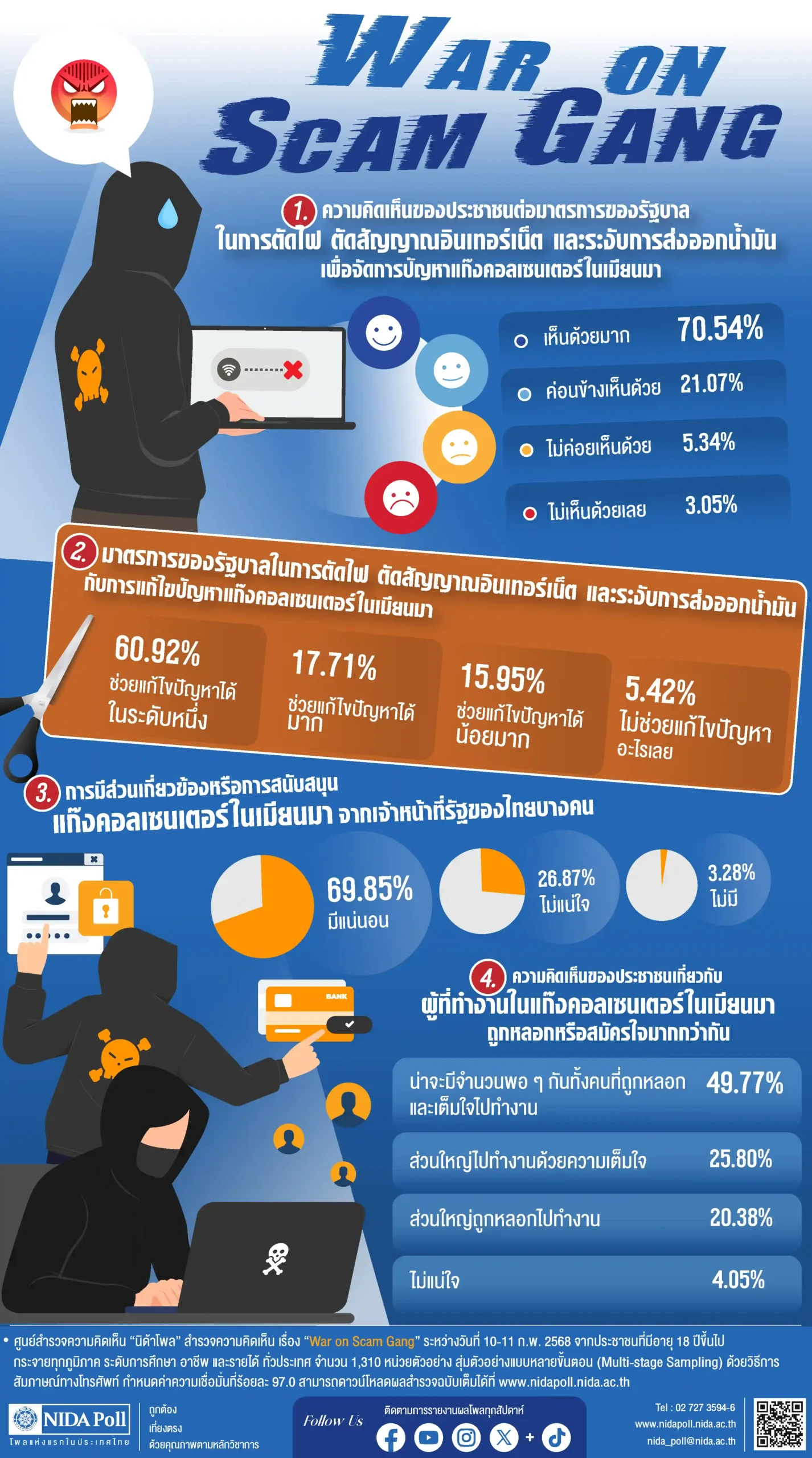 ศูนย์สำรวจความคิดเห็น “นิด้าโพล” สถาบันบัณฑิตพัฒนบริหารศาสตร์ (นิด้า) เปิดเผยผลการสำรวจของประชาชน เรื่อง “War on Scam Gang” ทำการสำรวจระหว่างวันที่ 10-11 กุมภาพันธ์ 2568 จากประชาชนที่มีอายุ 18 ปีขึ้นไป กระจายทุกภูมิภาค ระดับการศึกษา อาชีพ และรายได้ ทั่วประเทศ รวมจำนวนทั้งสิ้น 1,310 หน่วยตัวอย่าง เกี่ยวกับมาตรการของรัฐบาลในการจัดการกับปัญหาแก๊งคอลเซนเตอร์ที่มีฐานในเมียนมา การสำรวจอาศัยการสุ่มตัวอย่างโดยใช้ความน่าจะเป็นจากบัญชีรายชื่อฐานข้อมูลตัวอย่างหลัก (Master Sample) ของ “นิด้าโพล”สุ่มตัวอย่างแบบหลายขั้นตอน (Multi-stage Sampling) เก็บข้อมูลด้วยวิธีการสัมภาษณ์ทางโทรศัพท์ โดยกำหนดค่าความเชื่อมั่น ร้อยละ 97.0