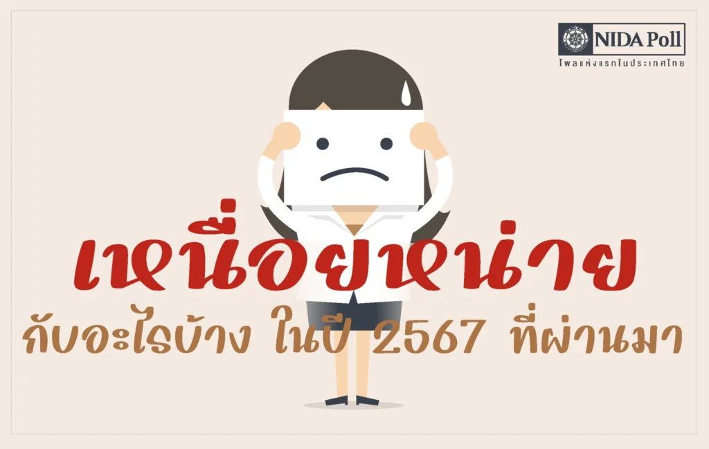ศูนย์สำรวจความคิดเห็น นิด้าโพล สถาบันบัณฑิตพัฒนบริหารศาสตร์ (นิด้า) เปิดเผยผลการสำรวจของประชาชน เรื่อง เหนื่อยหน่ายกับอะไรบ้าง ในปี 2567 ที่ผ่านมา ทำการสำรวจระหว่างวันที่ 16–18 ธันวาคม 2567 จากประชาชนที่มีอายุ 18 ปีขึ้นไป กระจายทุกภูมิภาค ระดับการศึกษา อาชีพ และรายได้ทั่วประเทศ รวมจำนวนทั้งสิ้น 1,310 หน่วยตัวอย่าง เกี่ยวกับความรู้สึกของประชาชนในปี 2567 ที่ผ่านมา การสำรวจอาศัยการสุ่มตัวอย่างโดยใช้ความน่าจะเป็นจากบัญชีรายชื่อฐานข้อมูลตัวอย่างหลัก (Master Sample) ของนิด้าโพล สุ่มตัวอย่างแบบหลายขั้นตอน (Multi-stage Sampling) เก็บข้อมูลด้วยวิธีการสัมภาษณ์ทางโทรศัพท์ โดยกำหนดค่าความเชื่อมั่น ร้อยละ 97.0