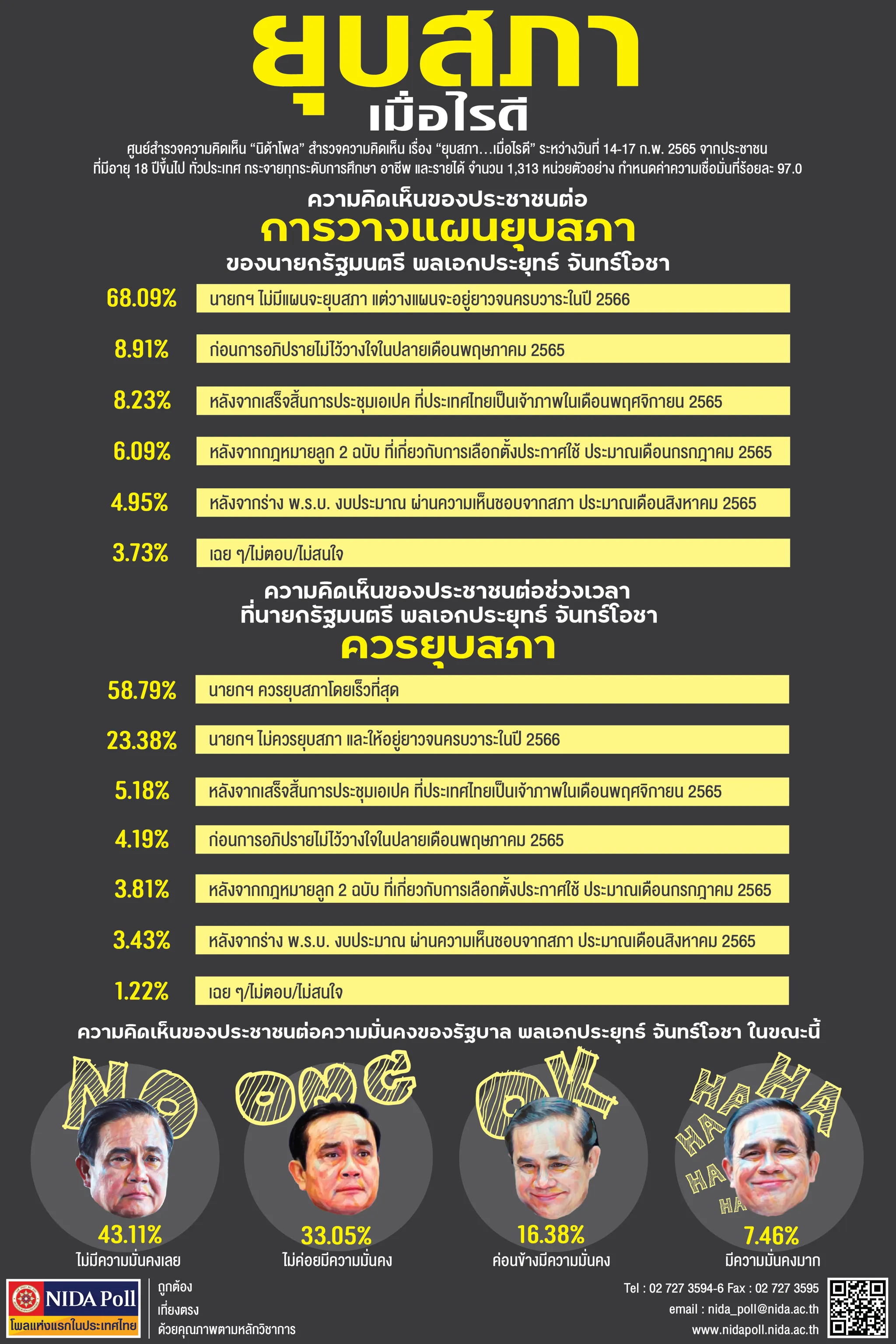 ศูนย์สำรวจความคิดเห็น นิด้าโพล สถาบันบัณฑิตพัฒนบริหารศาสตร์ (นิด้า) เปิดเผยผลสำรวจของประชาชน เรื่อง ยุบสภา…เมื่อไรดี ทำการสำรวจระหว่างวันที่ 14–17 กุมภาพันธ์ 2565 จากประชาชนที่มีอายุ 18 ปีขึ้นไป กระจายทุกภูมิภาค ระดับการศึกษา อาชีพ และรายได้ทั่วประเทศ รวมทั้งสิ้น 1,313 หน่วยตัวอย่าง เกี่ยวกับการยุบสภาของนายกรัฐมนตรี พลเอกประยุทธ์ จันทร์โอชา การสำรวจอาศัยการสุ่มตัวอย่างโดยใช้ความน่าจะเป็นจากบัญชีรายชื่อฐานข้อมูลตัวอย่างหลัก (Master Sample) ของ นิด้าโพล สุ่มตัวอย่างด้วยวิธีแบบง่าย (Simple Random Sampling) เก็บข้อมูลด้วยวิธีการสัมภาษณ์ทางโทรศัพท์ กำหนดค่าความเชื่อมั่น ร้อยละ 97.0