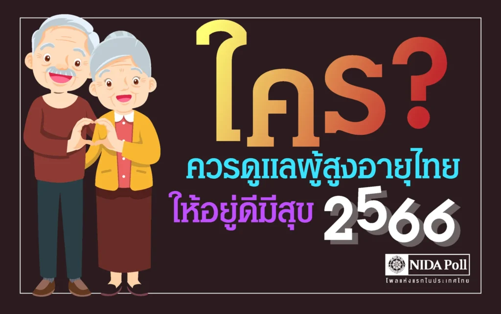 เนื่องในวันที่ 13 เมษายน ของทุกปี ตรงกับวันผู้สูงอายุ ศูนย์สำรวจความคิดเห็น นิด้าโพล ร่วมกับ ศูนย์วิจัยสังคมสูงอายุ (Center for Aging Society Research – CASR) สถาบันบัณฑิตพัฒนบริหารศาสตร์ (นิด้า) เปิดเผยผลสำรวจความคิดเห็น เรื่อง ใคร? ควรดูแลผู้สูงอายุไทย ให้อยู่ดีมีสุข ปี 2566 ทำการสำรวจระหว่างวันที่ 14-17 มีนาคม 2566 จากผู้ที่มีอายุตั้งแต่ 60 ปีขึ้นไป กระจายทุกภูมิภาคทั่วประเทศ จำนวน 1,310 หน่วยตัวอย่าง เกี่ยวกับความต้องการของผู้สูงอายุในการบริการและดูแลผู้สูงอายุในด้านต่าง ๆ จากสถาบันและหน่วยงานต่าง ๆ การสำรวจอาศัยการสุ่มตัวอย่างโดยใช้ความน่าจะเป็นจากบัญชีรายชื่อฐานข้อมูลตัวอย่างหลัก (Master Sample) ของ นิด้าโพล สุ่มตัวอย่างด้วยวิธีแบบง่าย (Simple Random Sampling) เก็บข้อมูลด้วยวิธีการสัมภาษณ์ทางโทรศัพท์ โดยกำหนดค่าความเชื่อมั่น ร้อยละ 97.0
