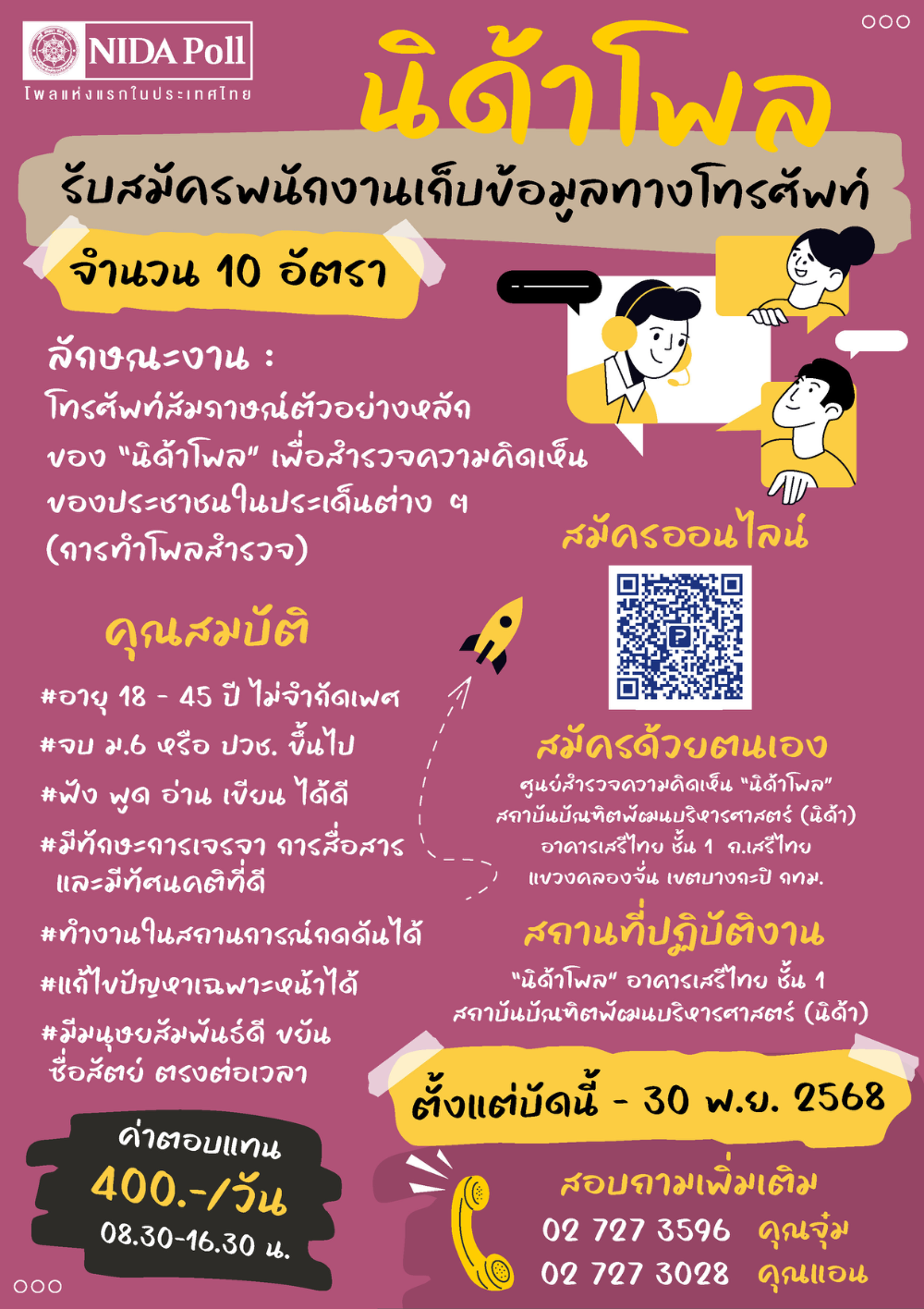 รับสมัครพนักงานเก็บข้อมูลทางโทรศัพท์ จำนวน 10 อัตรา